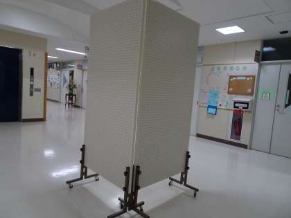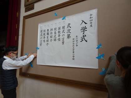 会場準備は、お花の水やりから、祝電披露、放送チェック、会場づくり、卒業式から入学式バージョンに代えていきます。