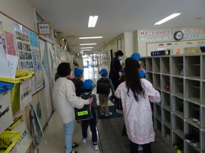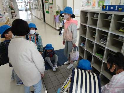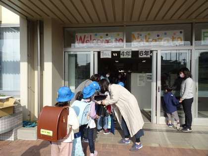 どの学年の児童も、張り切って登校してきました。検温をチェックし、下駄箱に向かう子どもたちです。6年生が、一生懸命1年生のお世話を開始しました。