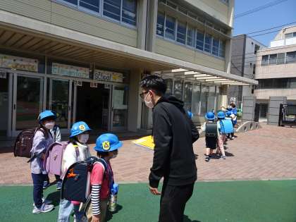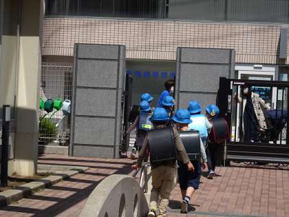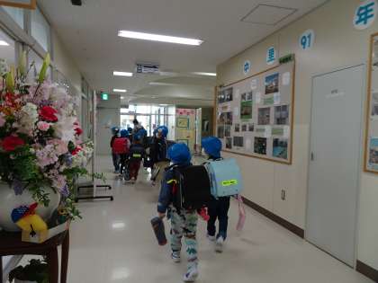 元気にあいさつしている1年生です。ランドセルが似合います。少したくましく見えました。