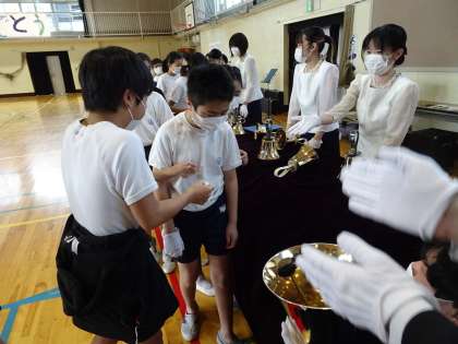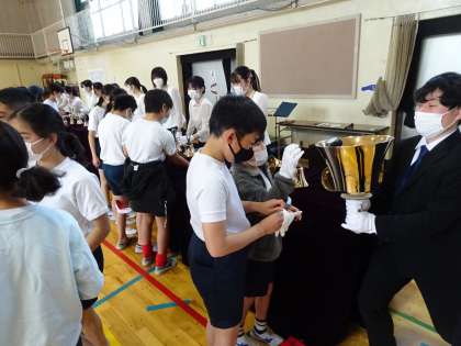 最後は、6年生のみ、いろいろ触らせていただきました。音を出させていただいたり、持たせていただいたり、大喜びの6年生です。