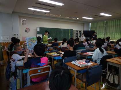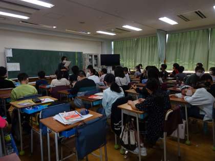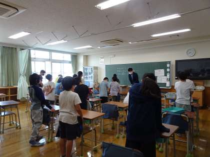4年2組は、元気な声であいさつをする練習をしました。6年生は、提出物の確認と授業の準備です。