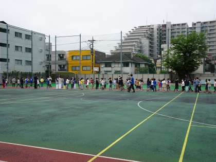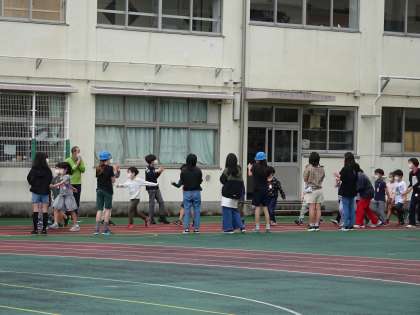 入場は、全校児童で花道をつくりました。1年生が、ミッキーマウスのテーマで元気よく行進するのを手拍子で迎えた上級生たちです。