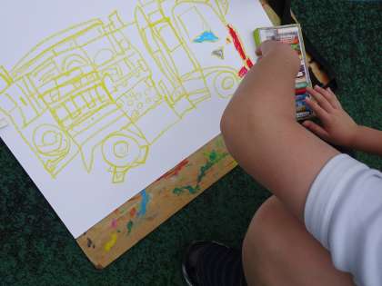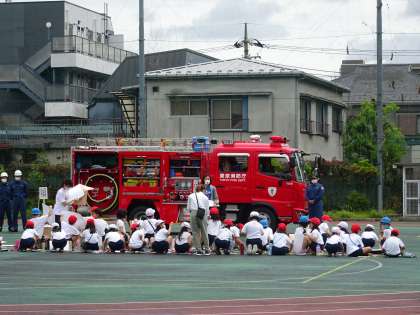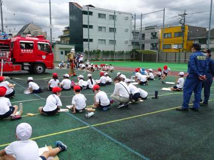 消防自動車から、ホースを出してくださったり、消防士の服を着てくださったり、暑い日でしたが、たくさんの演出をしてくださった世田谷消防署の皆さんです。