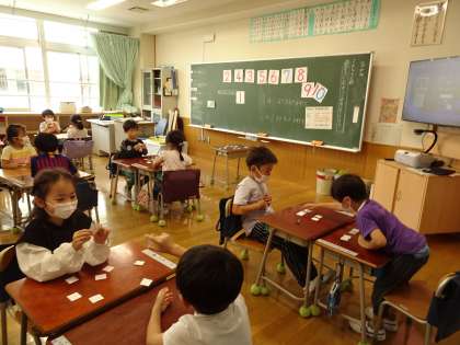 1と6はどちらが大きいか、〇と□はどちらが大きいか、ペアでゲームをしながら訓練しています。