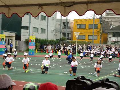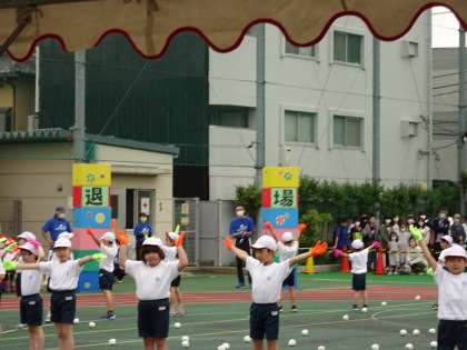 コロナ対策で、手袋を使う工夫をしました。ミッキーマウスのように踊ります。チッコリ玉入れは、音楽が止まったら玉入れをするルールです。懐かしの髭ダンスも入りました。