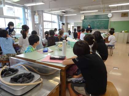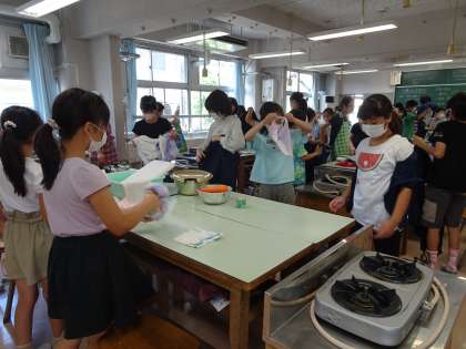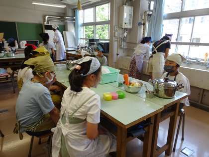 コロナ感染症対策を十分行い、川場移動教室の飯盒炊さんのカレー作りの練習をしました。家庭科の調理実習は、学校としてもこの2年間実施できなかったので、ガス栓から点検をして慎重に準備をしました。身支度をして、手順を確認しました。