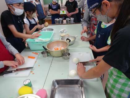 川場村でも、野菜はできるだけ薄く切り、火を通しやすくすることが代々受け継がれてきました。皆で協力して玉ねぎ、にんじん、じゃがいもを切り、火をしっかり見守り、煮込みました。洗い物も先にしておくと楽ですね。