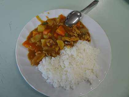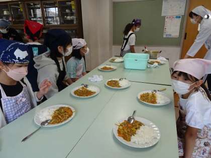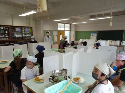 カレーライスは、自分の分を責任をもって盛り付けました。黙食をするので、パーテーションを立てました。コロナ禍における注意をしっかりして、完成しました。