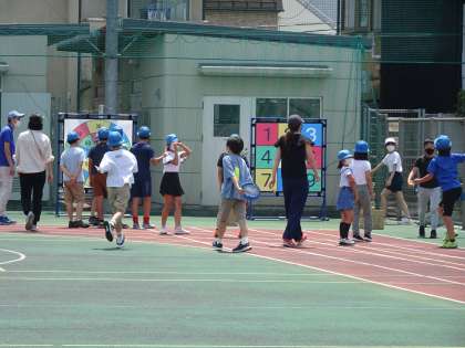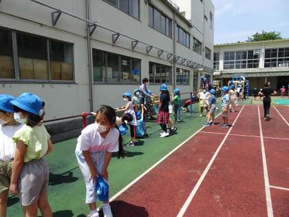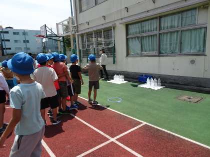 体力向上週間を設けました。運動委員会と教員が準備をし、見守ります。ペットボトルボウリング、ストラッグアウト、セストボール、どこにも行列ができています。鉄棒、ジャングルジム、雲梯も人気です。