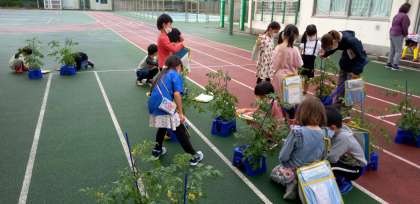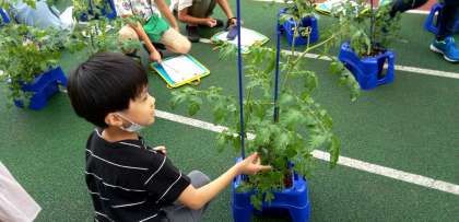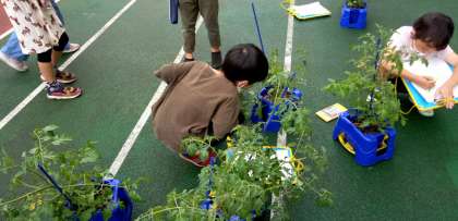 2年生がミニトマトの観察をしています。伸びる勢いがすごくて、ミニトマトがどっさりなっていて、子どもたちは大喜びです。