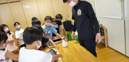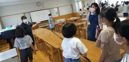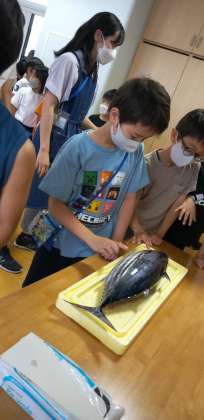 全校児童が、鰹を触らせてもらいました。釣竿も持たせていただきました。