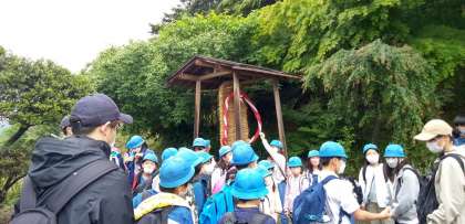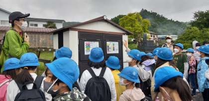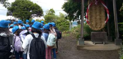 村めぐりの様子です。大わらじでグループごとの写真を撮りました。ゴミ箱は、観光客のために考えられたそうです。