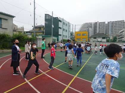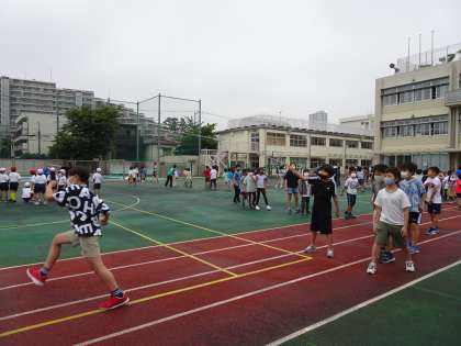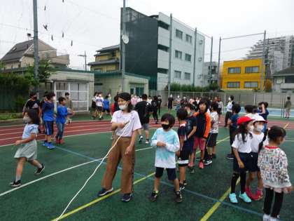 クラス対抗長縄集会です。各クラス威勢よく長縄をまわしています。「はい、はい、はい、」と、声を掛け合って競争します。