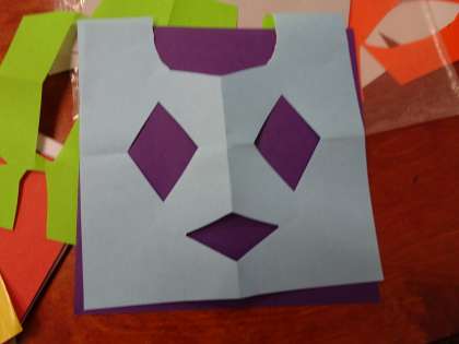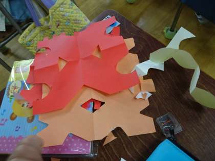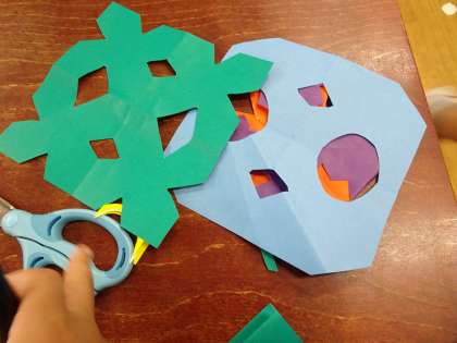 1年生は、図工で、折り紙を折ってから切って、偶然の模様を何かに見立てて学んでいます。お気に入りの形ができました。