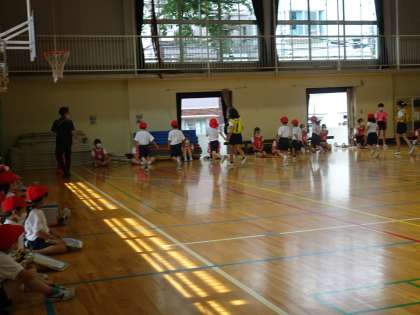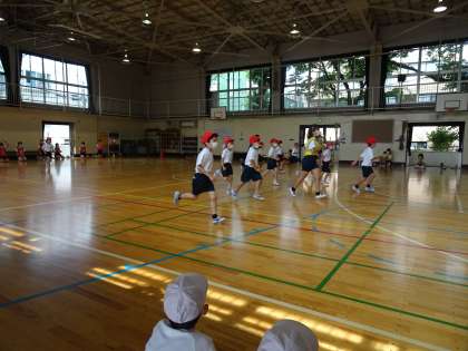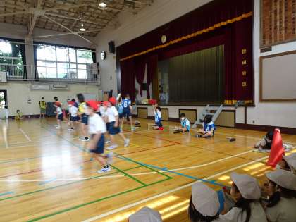 全校体制で、体力調査を実施しました。投力が落ちている現代っこです。今年度はどうでしょうか。6年生と1年生のペアで、シャトルランを実施しました。