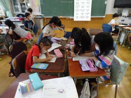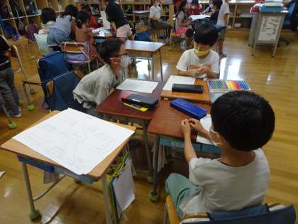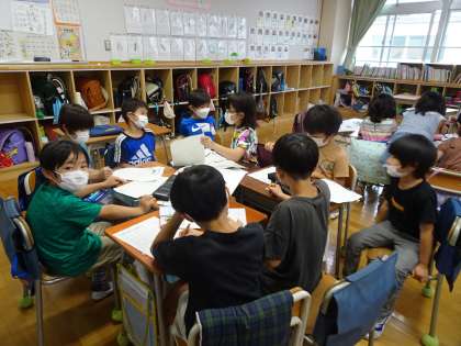 どのような発表をしようか、自然の中の生き物について語り合っています。
