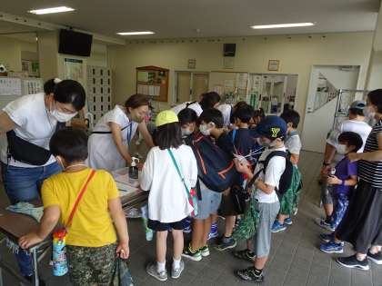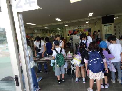今年度は、『中里わくわくフェスタ』。納涼子ども祭りの代わりに、いろいろなアイデアが出ました。楽しい企画をありがとうございました。まずは受付を通ります。