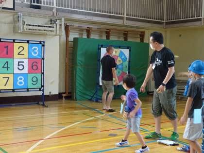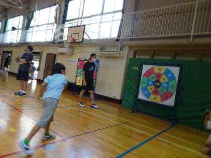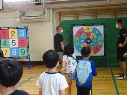 得点を競うストラッグアウト。行列ができました。何度も何度も挑戦する姿が見られました。おやじの会の皆さんのおかげで、楽しいコーナーになりました。