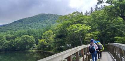 湯ノ湖畔のハイキングは、山の緑、湖の緑、たくさんのよい空気を吸い込んで歩きます。