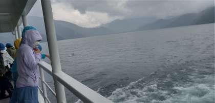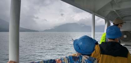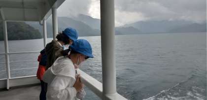 遊覧船ではしゃぐ子どもたち。