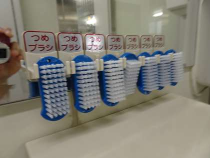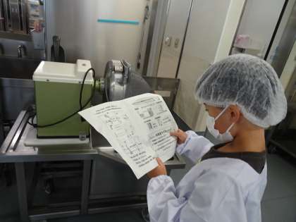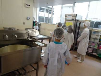 次の部屋に行くのに、エプロンを着替えること、手指をブラシでしっかり洗うこと、すべてにびっくりしてしまいます。次は、野菜を洗う流しです。保存庫もその場その場にあります。