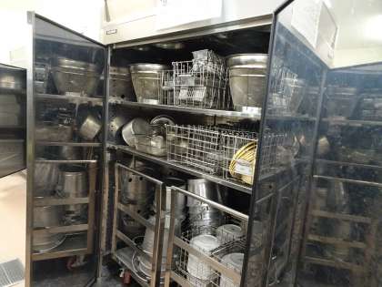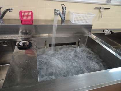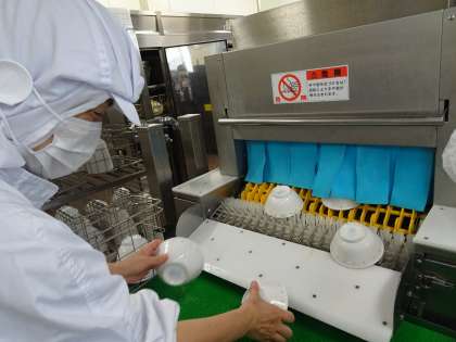 食器洗いは、手伝いたい人が多かったです。最初は大きな流しで手洗い、次にすすいで、食洗器に通す。そして点検しながら保管庫にしまっておくのですね。