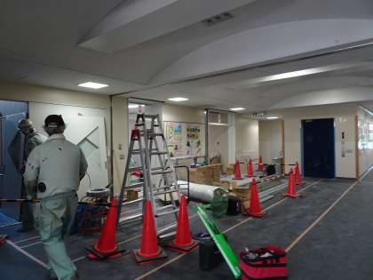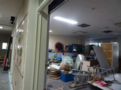 2階のプレイルームが教室になります。1階のプレイルームのドアや棚の付き方が変わります。家庭科室、パソコン室の天井を開け、電気の線などを整えて、きれいな部屋にします。