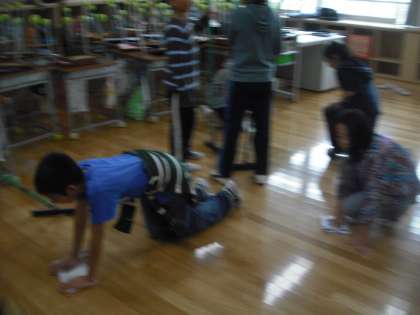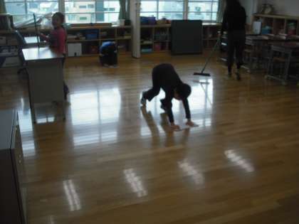 中里小学校は、給食の時間の後、昼休みがあり、その後、掃除の時間になります。机を運び、ほうきではき、雑巾がけをします。今日はがんばっている姿を紹介します。