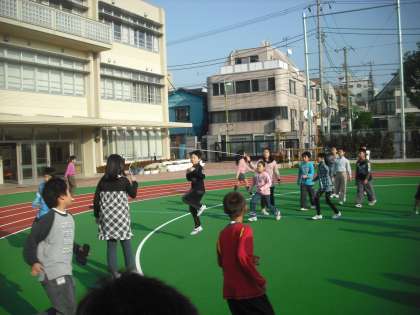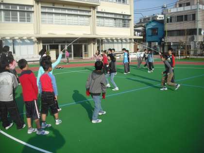 朝の運動の時間、3,4年生がクラスで大なわとびをしました。春先に比べ、なわの回転速度も上がっています。6年生で行う連合運動会が楽しみでもあります。