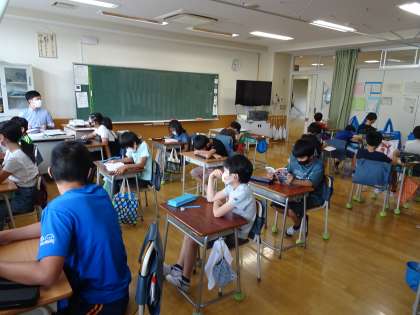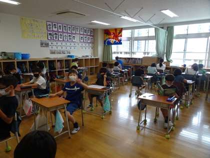 4年2組は、力だめしのテストです。早く終わった人は、読書をしています。