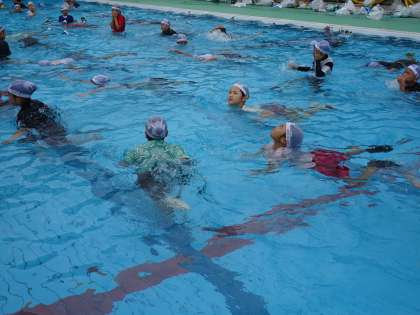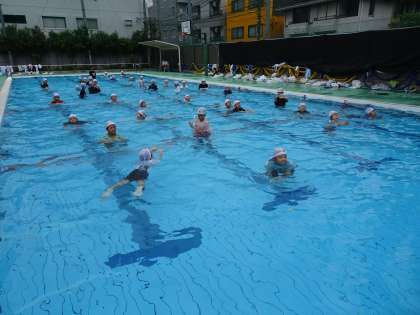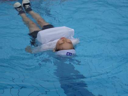 もしも、川でおぼれた時、何かにつかまり、浮くために知恵を働かせることができるか。そのようなことがないことを願いながらの訓練です。ペットボトルやビニールのレジ袋を使って、いろいろな浮き方を体験しました。