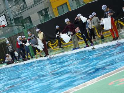 浮かび方も、いろいろやってみました。Tシャツそのものを膨らませて浮かんだり、ペットボトルを首の下にして仰向けに浮かんだり、試してみて研究しています。