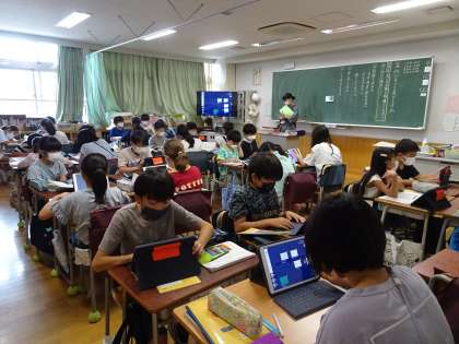 1年1組は音楽。5年生は国語。6年生は理科。それぞれ集中して取り組んでいます。
