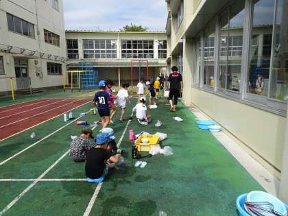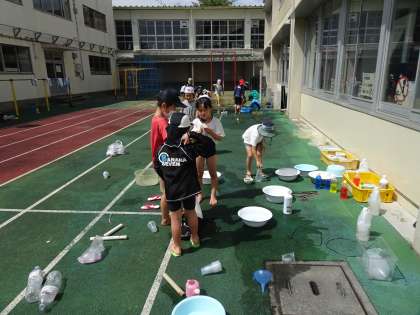 水の勉強です。いろいろな性質を使って水遊びをしました。活動そのものを楽しんでいました。片付けまで頑張りました。