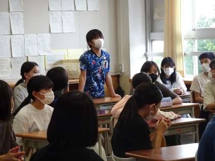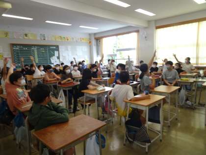 数学の先生の自己紹介は、とても楽しい内容でした。子どもたちは、中学で興味のある部活を紹介しました。