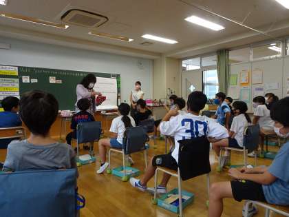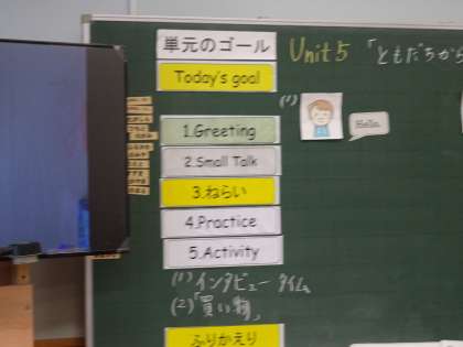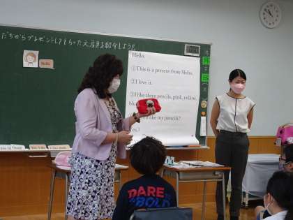 エミリー先生の楽しい授業です。4年生が体験しました。文房具屋さんになって、売ったり買ったりする時の会話をします。ゴールイメージをもって、体験型授業をしていきました。