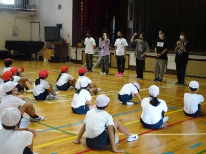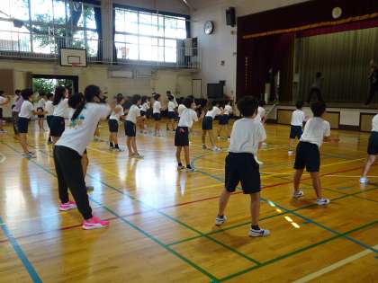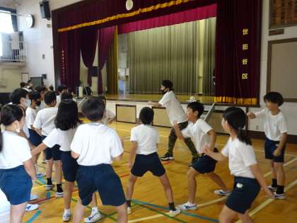 昨年度の9月に申し込んだダンス部門が当たりました。来年度のスポーツフェスタに向けて、ダンスパフォーマンスを学ぶワークショップを体験しました。演舞麗夢という団体のダンサーさんが、6人来てくれました。4年生の練習風景です。