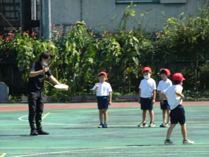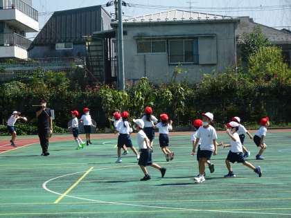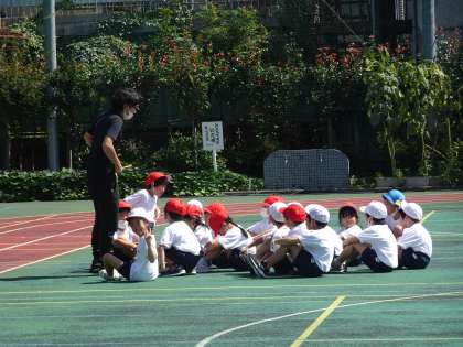 校庭を走り回り、猛獣狩りに行ったり、コミュニケーションを測ったり、体を使って楽しく運動していました。