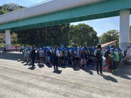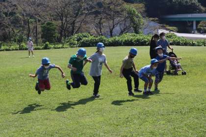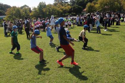 こどもの国到着。空の広さに感激している子どもたち。3年生、4年生、最高の遠足日和です。