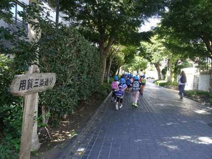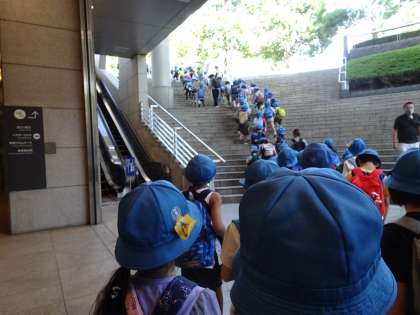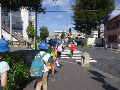 用賀駅に到着しました。暑い日でした。20分以上頑張って歩きました。砧公園に近付くまで、交通に気を付けて、しっかり歩く子どもたちに感心しました。