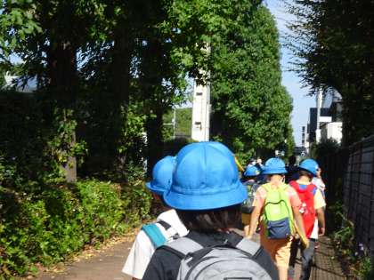 環状8号線も渡りました。緑道は木陰で、少し涼しかったです。長い列ですが、班ごとにルールやマナーを守ってとても上手に歩きました。