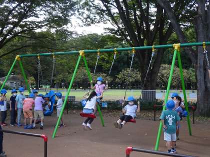 最近は、学校からブランコが消えました。子どもたちは、ターザンロープとブランコに並んで順番を待って乗り、楽しく遊ぶことができました。
