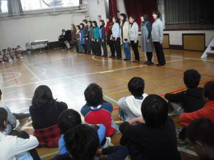 毎年12月に、PTAコーラスの皆様による歌のプレゼントを頂きました。子どもたちからは6年生がお礼の言葉を、そして全校による歌をお返ししました。