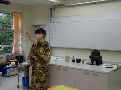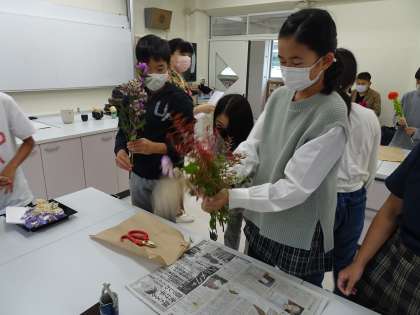 社会科、歴史、日本の伝統文化、家庭科、キャリア教育などいろいろな要素の入った勉強でした。保護者の方がゲストティーチャーです。礼儀を教わりました。まずは、生け花です。