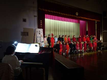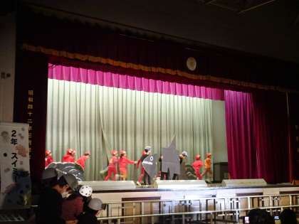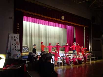 『スイミー』のテーマソングが、体育館いっぱいに響き渡りました。大きな魚を追い出す時の団結力が、印象的でした。海の中の生き物たちも、生き生きと演じることができました。