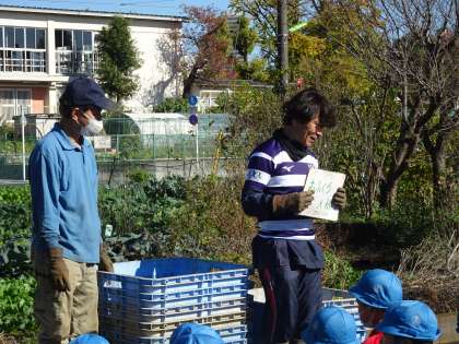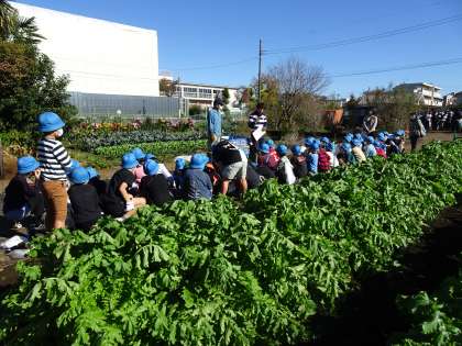 大きな葉っぱが畑いっぱいに広がっていました。広さと、1本の大根の大きさにびっくりする子どもたちです。