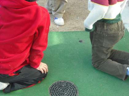 3年生は理科でじしゃくについて学習しています。今日の昼休みは、ビニール袋と磁石をもった3年生が砂場で遊んでいました。その様子を興味深く見る2年生もかわいらしかったです。