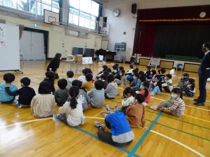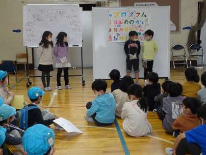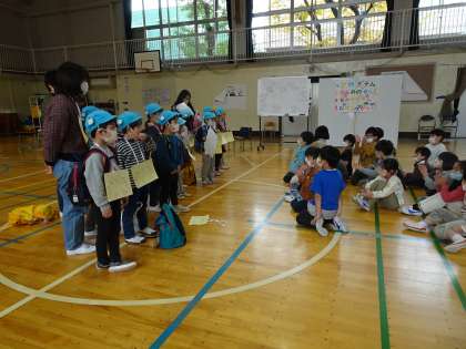 1年生のアイデアは素晴らしいですね。どうしたら、保育園の子どもたちが喜んでくれるか、一生懸命考えたことを実行できました。友達と協力して楽しむことが一番大事ですね。終わりの言葉も、振り返りも立派にできました。