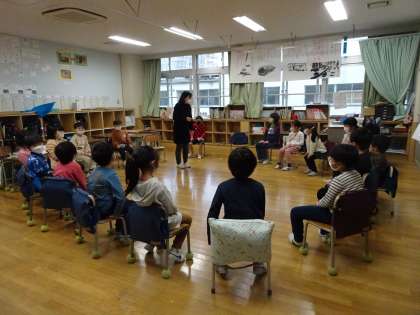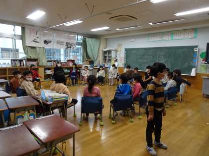 1年生は、震源地というゲームを楽しんでいました。友達のことに関心をもち、ルールを守る大切さを実感できるゲームです。