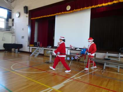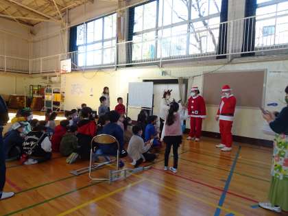 英語の絵本の後は、マジシャン登場です。本業は、お医者さまだそうです。いろいろな仕掛けを予想する子どもたちでした。最後は、ビンゴゲームで、お土産をたっぷりいただきました。サンタさんも協力してくれました。